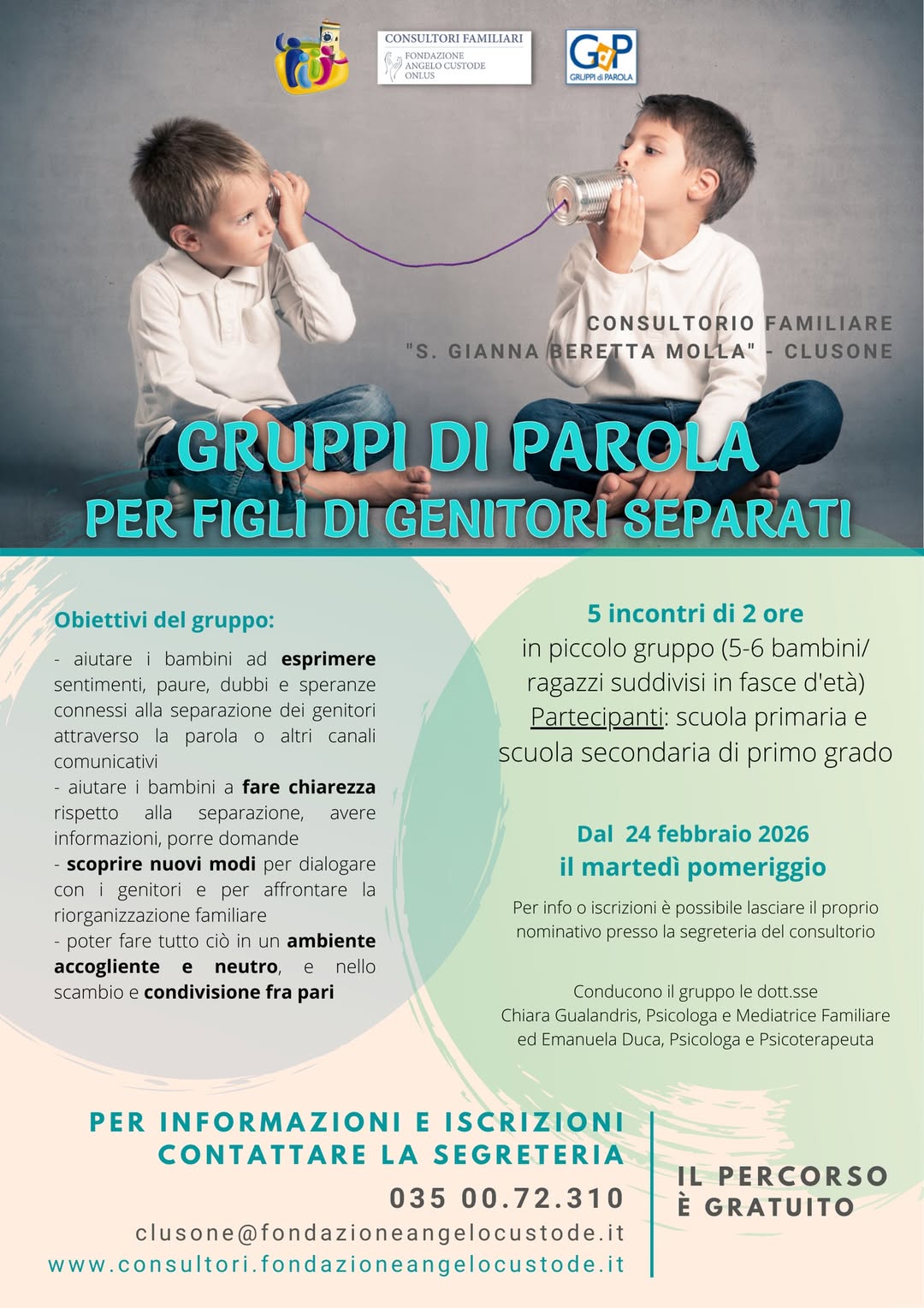 Per informazioni e iscrizioni contattare la segreteria 035.0072310, clusone@fondazioneangelocustode.it