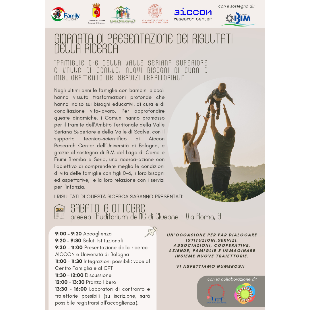Sabato 18 ottobre 2025 presso l’Auditorium della Scuola Primaria dell’Istituto Comprensivo di Clusone sito in Via Roma n. 9 si terrà la presentazione dei risultati della ricerca “Famiglie 0-6 della Valle Seriana Superiore e della Val di Scalve – Nuovi bisogni di cura e miglioramento dei servizi territoriali”